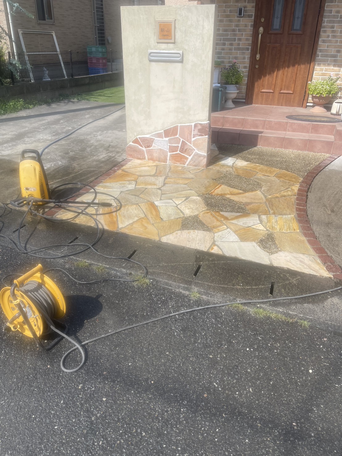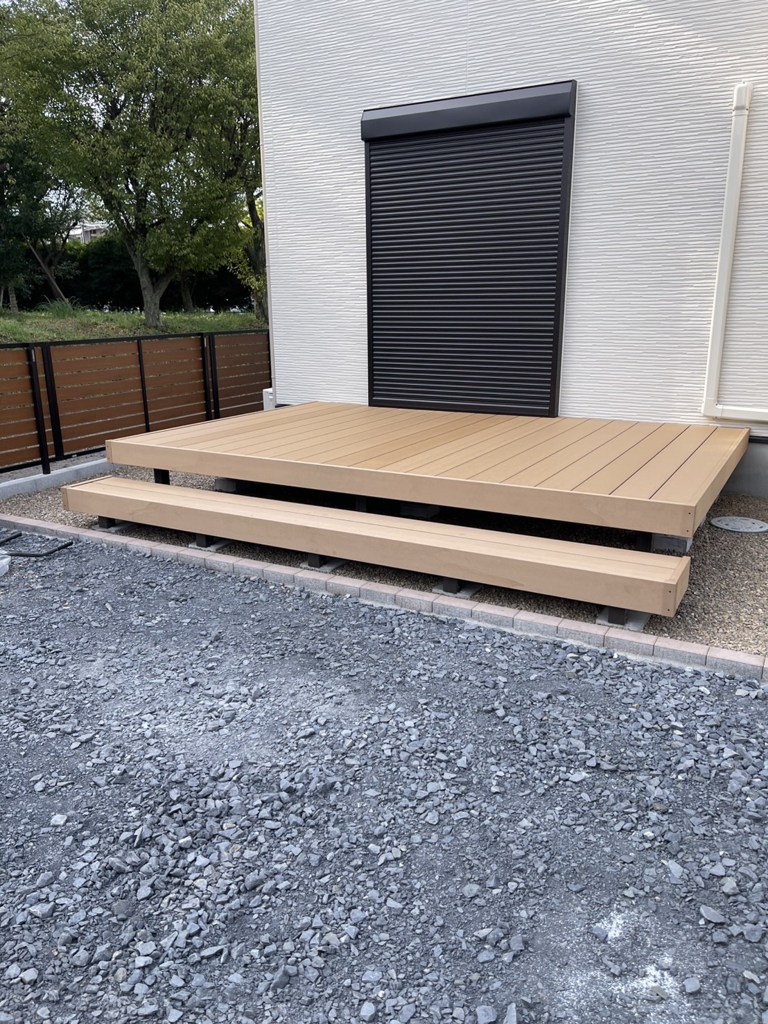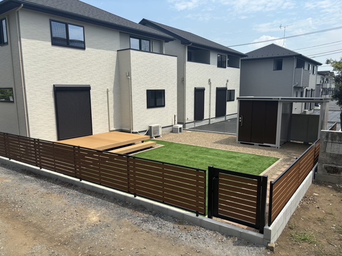お庭工事のご依頼いただきました。 デッキ・人工芝・物置・フェンス・門扉の施工を行いました。 また散水栓も立水栓に取替えて使いやすい高さで施工しています。